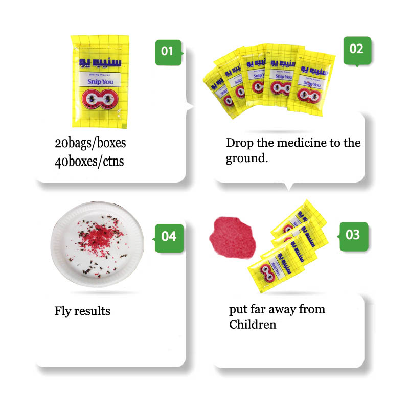 fly killer powder acts as an irresistible "food signal" to flies, actively attracting various types of flies, including fruit flies, houseflies, and green bottle flies, to gather and feed.